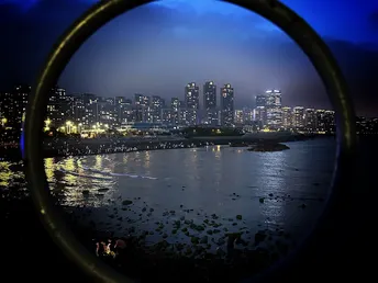 这张图用圆环框住城市暮色,特别有“偷瞥人间烟火”的氛围感:蓝调夜空下,楼宇灯火揉进浪里,岸边人影散着松弛,既藏着都市的温柔,又裹着海边的烟火气,像把一整个黄昏的浪漫都圈进了镜头里。