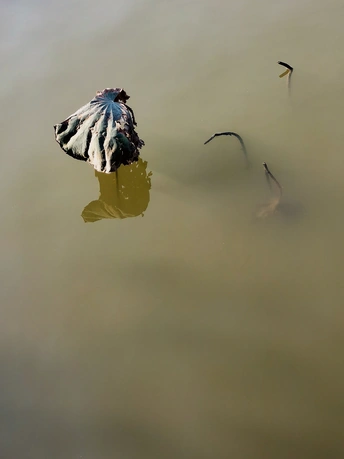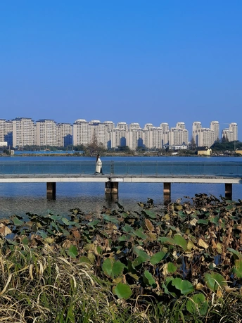 洋泾湖,木屋、残荷、行人和狗,构成一幅美丽的画卷。