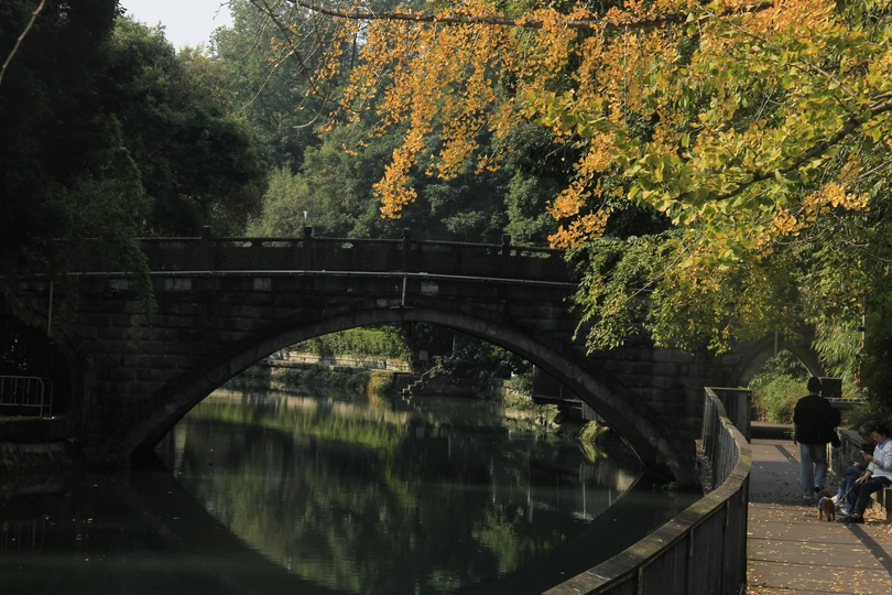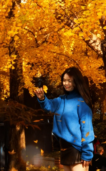 银杏把整个秋天酿成了金箔酒。 你看那叶片,是时光裁出的小扇子,在屋檐下摇落碎金,在玻璃杯旁静卧成诗,在楼宇间的风里簌簌地写着季节的信笺。有人将它托在掌心,看它与蓝毛衣撞出温柔的色块;有人在树下拾它,任它落满肩头,落成一整个秋的重量。 它是古城的标点,在石桥边、乌篷旁,把流水衬得更静,把岁月晕得更暖。每一片都藏着阳光的指纹,每一次坠落都是给大地的吻 —— 这秋黄,是天地写给人间的情书,页页动人,句句温柔。