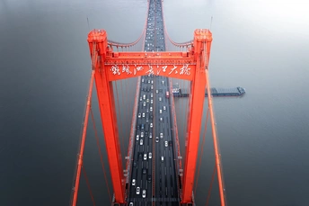 都说晴川历历汉阳树,芳草萋萋鹦鹉洲。不过入冬前的降雨让二者似乎都看不到,最后利用无人机,拍摄大桥的俯瞰视角的构图,红色的桥体在画面之中十分的醒目,与浅蓝色的水面和天空形成对比,钢缆给了画面延伸的感觉,穿行的船只和车流给了画面以活力。