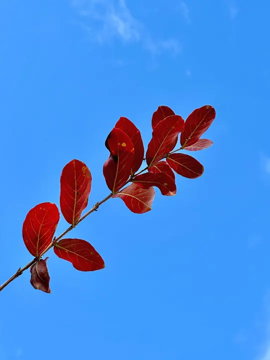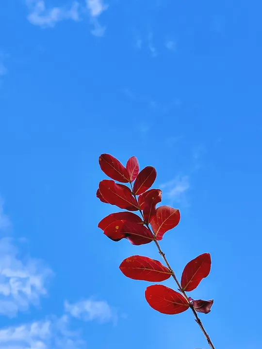 抬眼时,天是被洗过的蓝——不是浓稠的墨,是薄透的、带着云絮呼吸的蓝,风一吹,连颜色都软得发颤。每片红叶都撑得舒展:叶脉是浅金的线,把焰色的红分成细碎的暖,叶尖卷着点秋的绒,连边缘那点浅褐的小斑,都像阳光吻过的印子。云慢慢飘,叶轻轻晃,红与蓝就在空气里碰出软的涟漪。原来秋从不是冷的,是夏把余温织进了叶里,让同一枝红,能在同片蓝底上,开出两种风格。