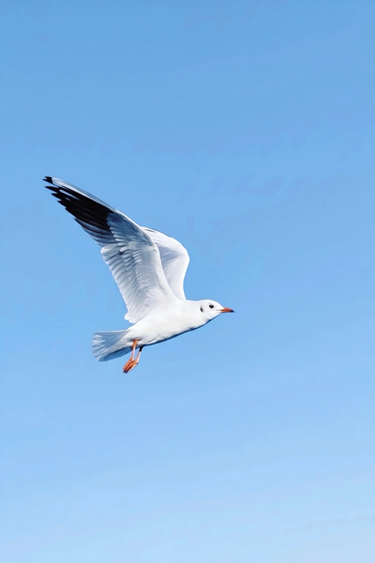 海鸥在空中展开白色的弧线,像风写下的字,被天空轻轻读着。它借一缕海风,就能越过浪与光,翅尖掠过云影,寂静却有力量。那一刻,世界都停在它的飞翔里。”