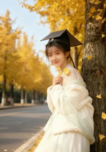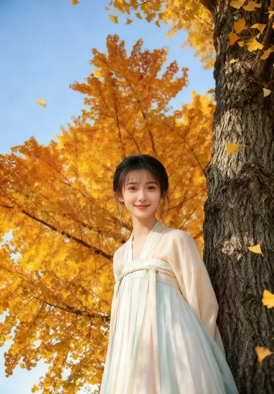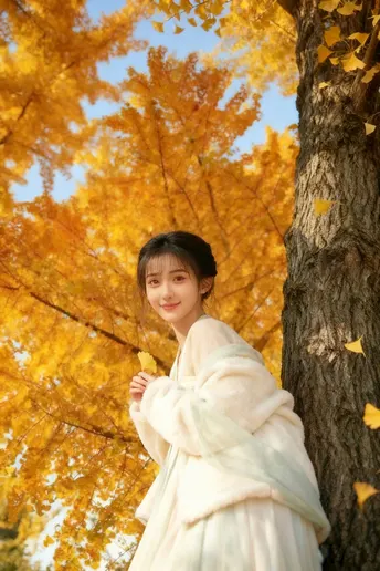 成都的银杏路是季节写给城市的一封情书。金黄的叶片簌簌落满肩头,像一场温柔的梦。 古装少女斜倚着树干,云纹帽檐下,青丝被风轻拂,发梢缠着一片旋落的银杏叶。 她指尖捻着一枚银杏叶,侧脸的轮廓在光影里被描得格外温柔。脚下是碎金般的落叶,远处是青砖黛瓦的老墙,与这满树的金黄相映成趣。 风掠过发梢,带着深秋特有的清冽。她的眼神里,藏着这座城市最柔软的秋意,像一幅被时光浸软的画,连风都轻了几分。