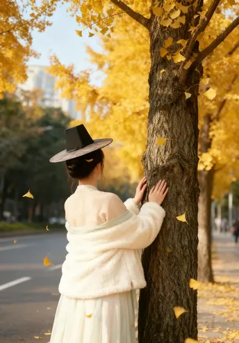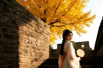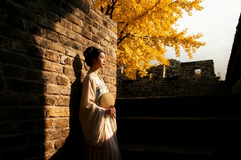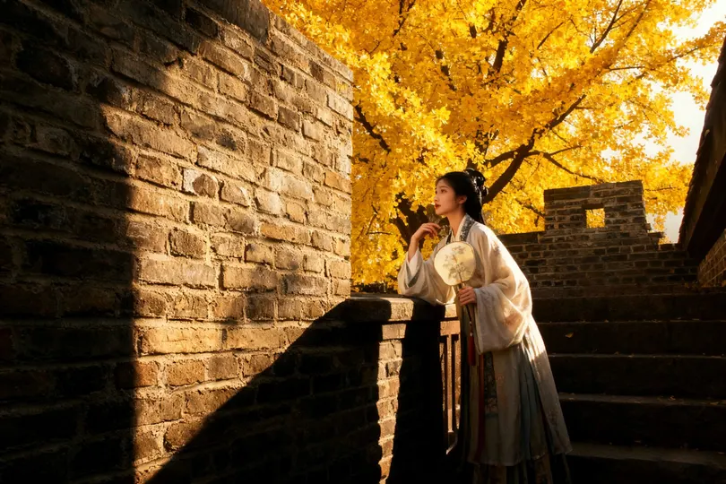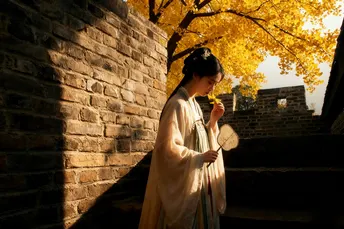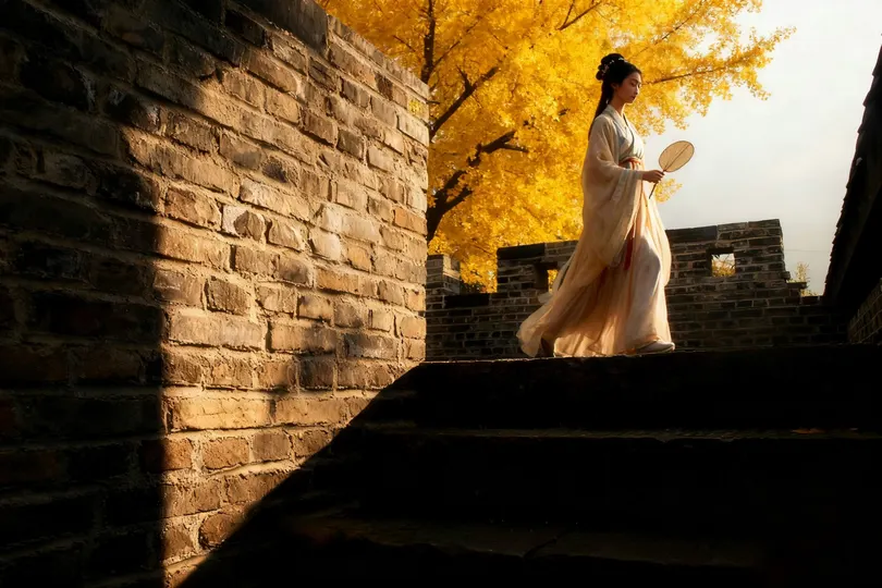 古城墙的石阶上落满银杏,持扇的女子立于光影间。有时侧身望云,有时轻拢裙摆,金黄的叶片从她肩头簌簌滑落,将深秋的温柔,都藏进每一个抬眸与转身里。