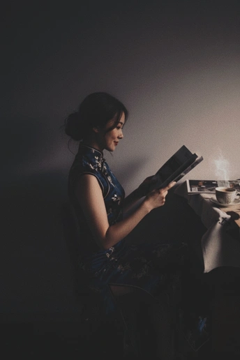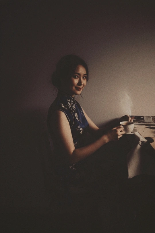 一卷在手,万籁俱寂。 昏黄的光线被旗袍的蓝丝绒温柔地捕获,勾勒出岁月沉淀的静美。 她是画中人,亦是时空外。 热茶的白雾,是心头升起的一缕遥远心事;而翻阅的纸页,载着她穿越时空,在尘嚣之外独享一方清宁。 所有的繁华都在此刻退场,只留清风与书香。 仿日本摄影师调色胶片相机