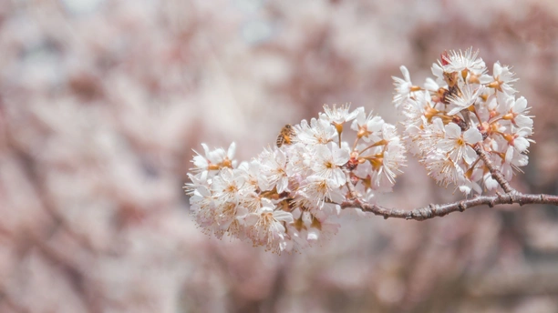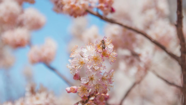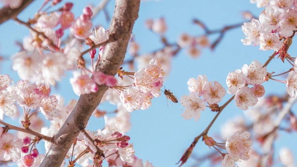 粉白樱瓣浸在晴光里,蜂翼抖落的甜香,正沿着花枝漫进风里。