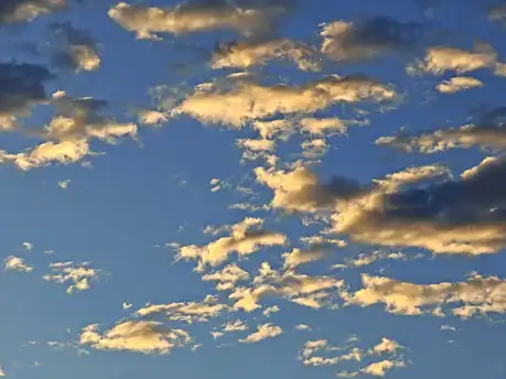 这是黄昏写给天空的信笺——澄澈的钴蓝色是底色,被落日吻过的云絮则成了信上跃动的金箔。 你看那些云,不是规规矩矩的棉团,是被风揉碎又轻铺的金纱:边缘泛着绒绒的暖黄,像被阳光烤化的蜂蜜,裹着蓬松的云絮;而云的褶皱里还藏着浅灰的阴影,让这柔软多了几分层次,像把傍晚的光都织进了云的肌理里。它们散得随性,却又像有细密的线牵着——这片絮状的云搭着那片团状的云,在蓝幕上扯出一张轻软的网,把白日的余温都兜在里面。 风该是这张网的织工吧?它把云缕扯得纤细,又把云团堆得蓬松,让每一缕金絮都沾着落日的温度。这时候的天也温柔,蓝得不扎眼,像浸了水的蓝丝绒,衬得那些金边云更像偷跑出来的星光碎片。站在这样的天空下,连呼吸都像裹了层暖绒,好像伸手就能接住一捧被阳光晒软的云。
