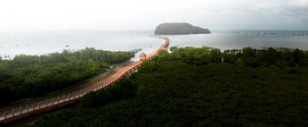 阴天的海面笼着层薄纱般的雾,红树林像块深绿的绒毯铺在岸边,那道橙红的栈道弯成温柔的弧线,一头扎进绿意,一头牵向远处的小岛——像是给这片静谧的水天,系了条轻快的丝带。远处零星的船影晃着,连风都慢了下来。
