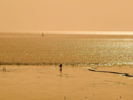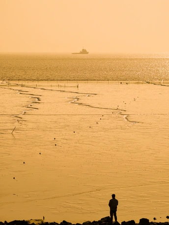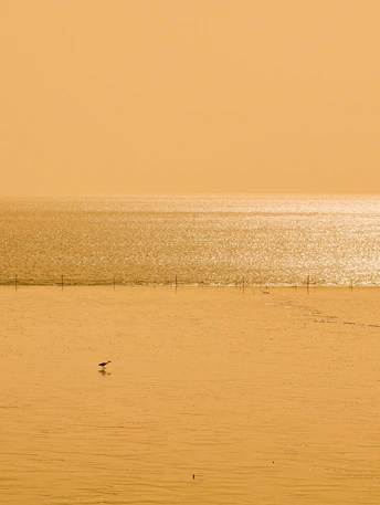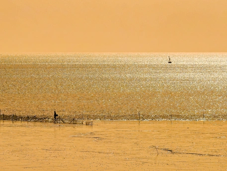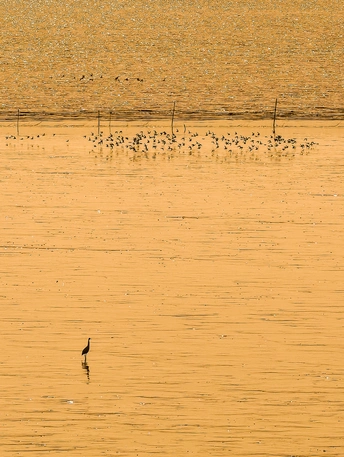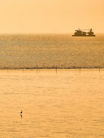 长焦定格孤鸟静栖、群鸟掠空的动静之美,广角收录渔民踏滩、远帆映金的人文画卷,每帧都是光影与山海的诗意碰撞。