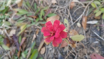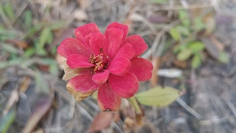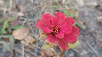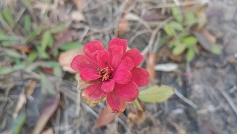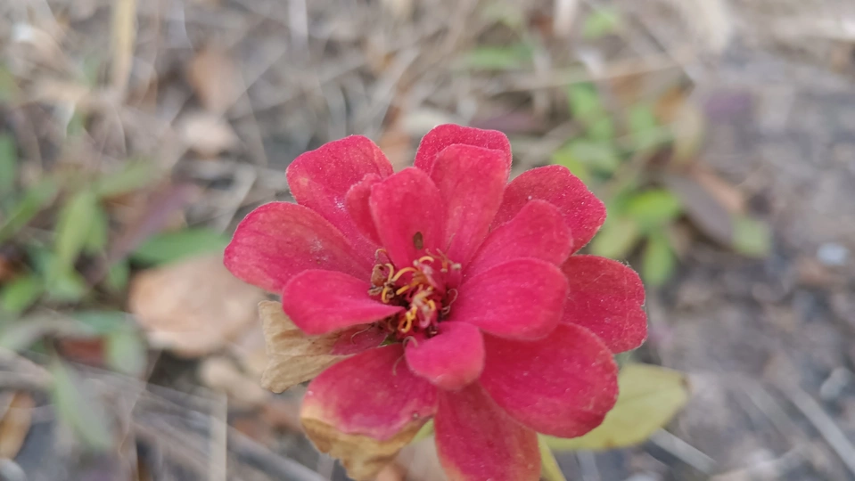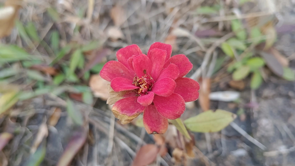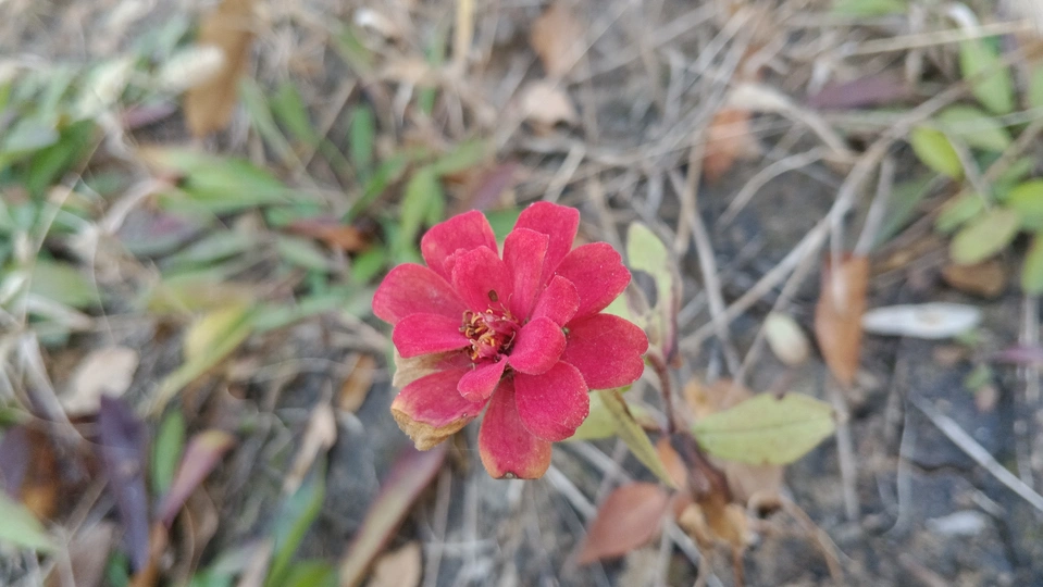 残红里的秋野韧 秋的枯屑裹着凉意,这朵百日菊却把炽红揉进了残瓣里——瓣边晕着浅褐的痕,星点细尘沾在绒纹上,像被时光轻吻过的笺,偏要在荒丛里撑出热烈的模样。 细茎斜斜地举着它,蕊间金绦蜷成簇,连那片蜷卷的褐瓣,都成了温柔的注脚。它没躲秋的凉,反而把虫啮的印、风磨的褶,都织成了韧的纹路:每道浅痕都是生长的勋章,每缕红都是不肯褪色的倔强。 这哪是将谢的花?是秋野里醒着的焰,把凉雾都焐成了软的诗。原来最动人的艳,从不是盛时的灼目,是残红里藏着的韧,是荒寒中挨着的暖。
