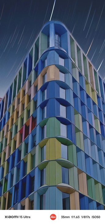 夜色里的彩色建筑立面,蓝绿黄的撞色线条勾勒出建筑的弧度与肌理,徕卡镜头下的35mm视角,将建筑的几何美感与夜空中的星轨交织,冷调的夜空衬着暖艳的建筑色彩,科技质感与艺术美学在画面里碰撞融合,定格出城市建筑独有的视觉张力。