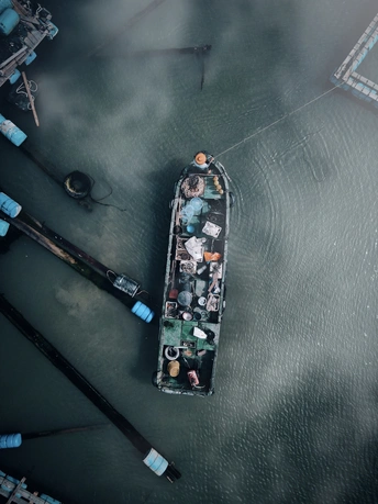 雾霭漫过海面,老旧的渔船静静泊在水间,船板上的渔具与杂物,像是藏着一船的海风与故事。它不再追逐浪潮,只在这方水域里,守着时光的慢,也守着海的温柔与沉默。