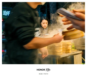 夜色把蒸笼的白汽揉成一团暖雾,路过的人用手机留住这口热乎气,仿佛把整座城市的烟火都攥在了手里。