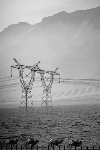 自驾去往喀什路过巴楚的戈壁时, 远远看到雾蒙蒙的山脚下立着几座高压电塔, 和荒漠的粗犷感形成特别的反差, 立刻停车找机位。 选了能把骆驼群、电塔和远山都纳入画面的角度, 用长焦压缩空间让元素更紧凑, 又调成黑白模式弱化色彩干扰, 突出光影和线条的对比。 等骆驼群走到围栏边的瞬间按下快门, 刚好捕捉到自然生灵与工业建筑同框的画面, 浮尘天的朦胧感也让整体氛围更有层次。