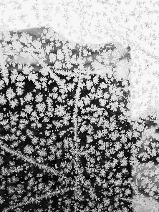 冬日的窗玻璃成了天然画布,霜花肆意生长成繁密的簇状,黑白镜头下,冰的肌理凝成了最灵动的抽象画。