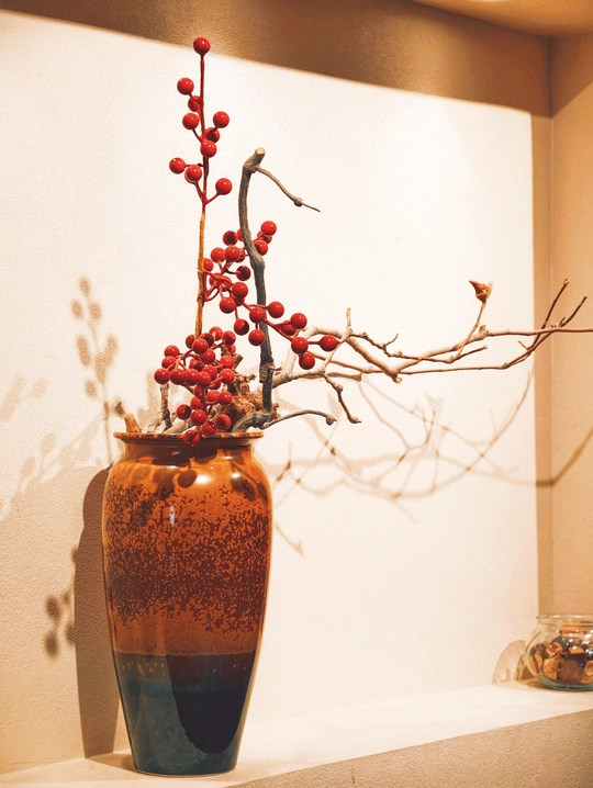 红果枯枝,光影里的中式雅致 文案:傍晚的室内光线柔和,我用24mm视角拍下这瓶红果枯枝。焦糖与墨蓝渐变的陶瓶立在素墙前,瓶身的斑驳肌理像被时光摩挲过,艳红的果簇从枯枝间探出来,鲜活的色彩瞬间点亮了整个画面。 蔡司镜头对色彩的还原让我惊喜,红果的浓郁、枯枝的深褐、陶瓶的暖棕,在画面里形成了温润的色彩层次。枯枝斜伸的线条是这张照片的灵魂,苍劲的枝桠在素墙上映出疏朗的影子,光影随着枝桠的走向蜿蜒,像在墙上画了一幅写意的水墨画。 拍中式插花总偏爱这种“疏”的感觉,不用繁复的花材,一枝红果、几截枯枝,就能勾勒出东方美学的雅致。陶瓶的厚重承托着花枝的轻盈,红果的鲜活对比着枯枝的沉静,一轻一重、一艳一枯,在小小的一方画面里,揉出了中式生活里独有的慢与美。按下快门时,只觉得这份简单的景致,就足够抚慰日常的琐碎。