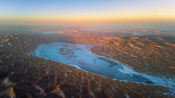 哈尔斯台,位于内蒙古阿拉善左旗,腾格里沙漠边缘的秘境地标,蒙古语寓意“风沙雕琢的留白地”。这里没有密集的人文建筑,唯有戈壁与沙丘交织的原生地貌,远处贺兰山轮廓隐约可见,构成“大漠孤烟直”的苍茫画卷。日出时暖金光线洒在沙丘上,勾勒出极具层次感的光影线条,我升起无人机,记录下这惊叹的瞬间