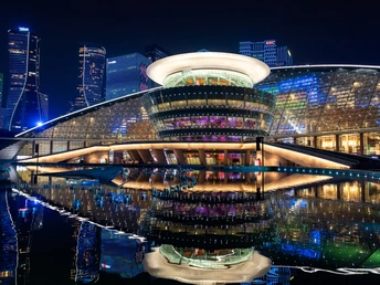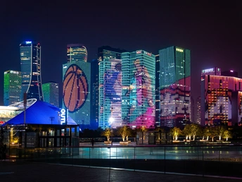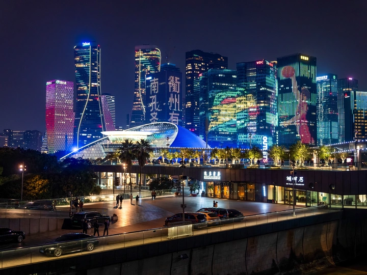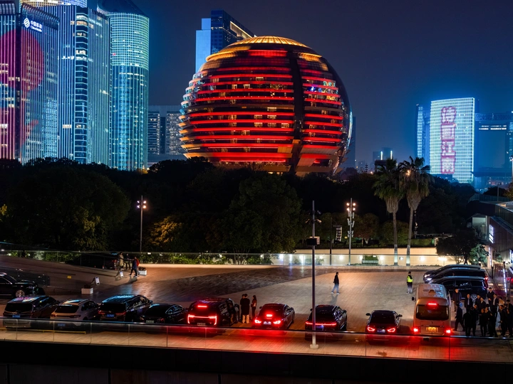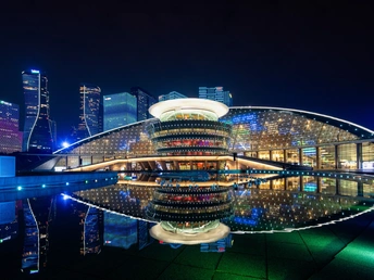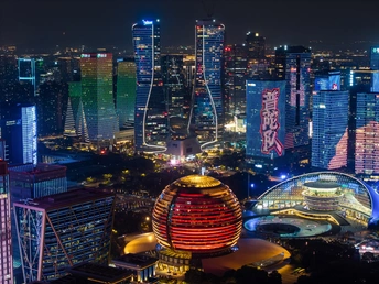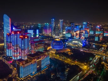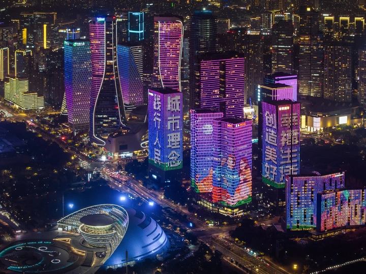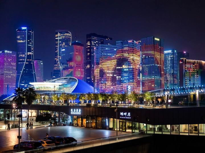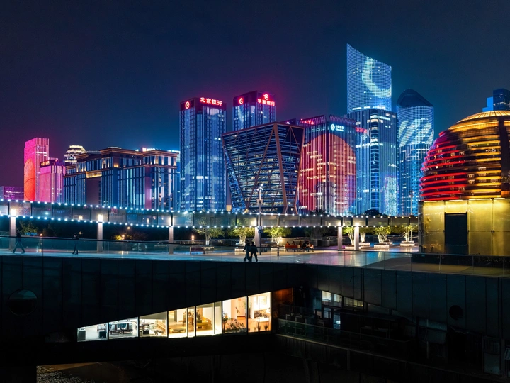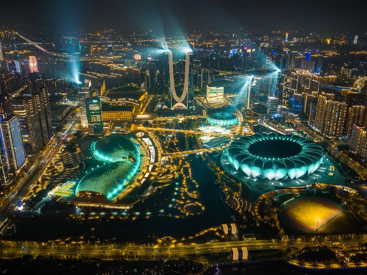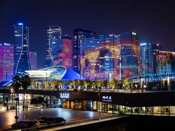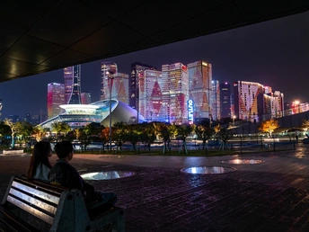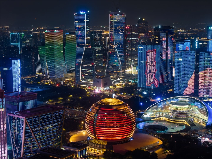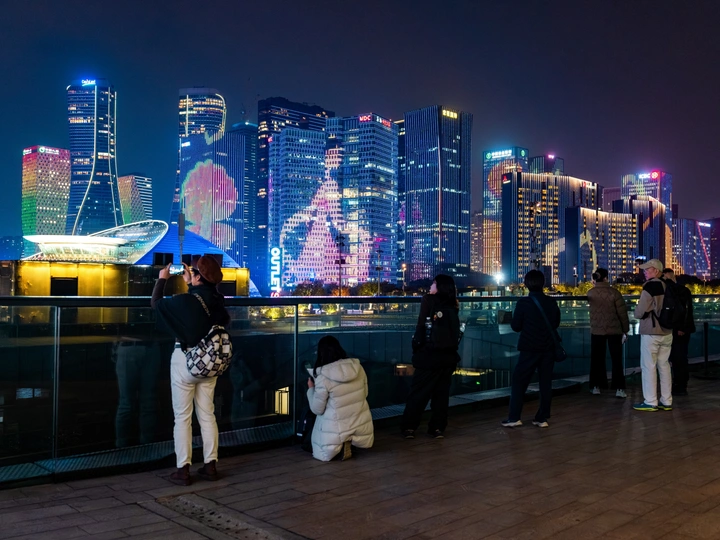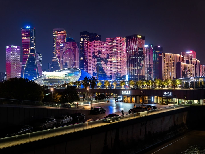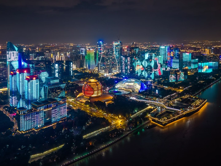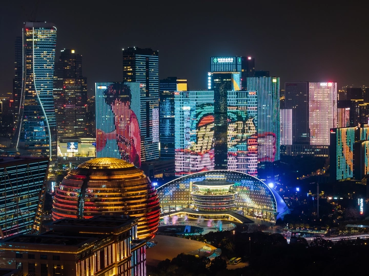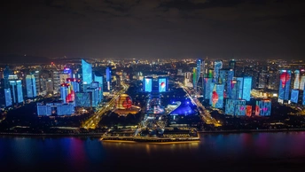 钱江新城灯光秀是杭州夜间经济的标志性景观,最佳观赏点在钱江新城城市阳台。