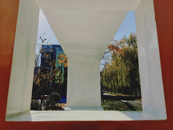 这照片拍摄于一处孩子玩游戏的公共设施,其中一处中间过道前方正好有两个相同形状的几何通孔,按近大远小的拍摄方法随拍了一张效果还真不错。