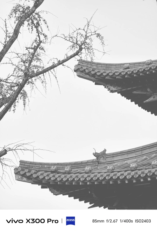 漫步古建区时,抬眼撞见飞檐与枯枝的同框,立刻用vivo X300 Pro的85mm长焦镜头按下快门,以黑白影调定格这份中式美学的留白。f/2.67的光圈让画面细节拉满,飞檐上瓦当的纹路、檐角瑞兽的雕刻轮廓,甚至枯枝上细碎的果荚纹理,都被蔡司镜头精准捕捉,没有一丝模糊。 黑白滤镜滤去了色彩的纷扰,让视觉焦点全然落在线条与质感的碰撞上。枯枝的苍劲线条斜斜划过画面,与飞檐的曲线形成巧妙的视觉呼应,两处飞檐错落的轮廓在浅灰的天空下更具张力,像一幅极简的中式水墨画。1/400s的快门速度稳稳定格了这份静态的美感,即便ISO调至2403,蔡司镜头的控噪能力依旧出色,画面没有多余噪点,黑白灰的层次过渡自然又细腻。 拍这张照片时,我特意让枯枝占据画面左侧,飞檐在右侧形成视觉平衡,留白的天空让画面多了呼吸感,这正是中式美学里“疏影横斜”的意境。老树的沧桑与古建的厚重在单色画面里相融,枯枝的疏朗柔化了飞檐的硬朗,一柔一刚间,藏着时光沉淀的韵味。 蔡司镜头对黑白影调的还原让我惊喜,深黑的瓦当、浅灰的枝干、纯白的天空,三层色调勾勒出画面的立体感。这帧简单的构图,却像一场无声的对话,枯枝依着飞檐!