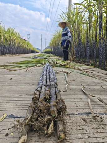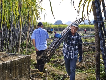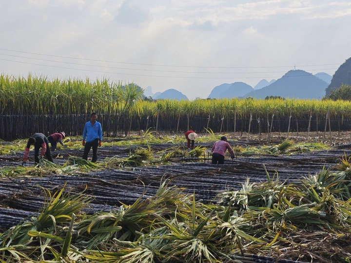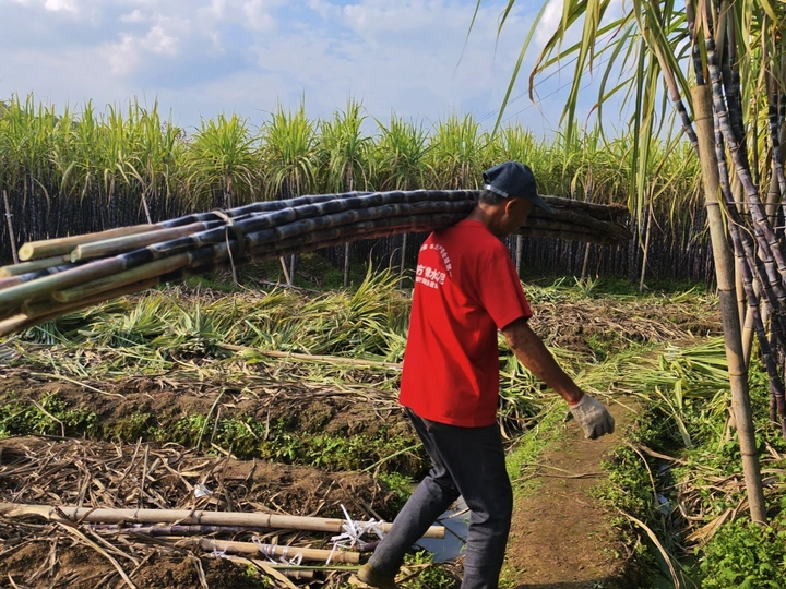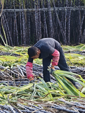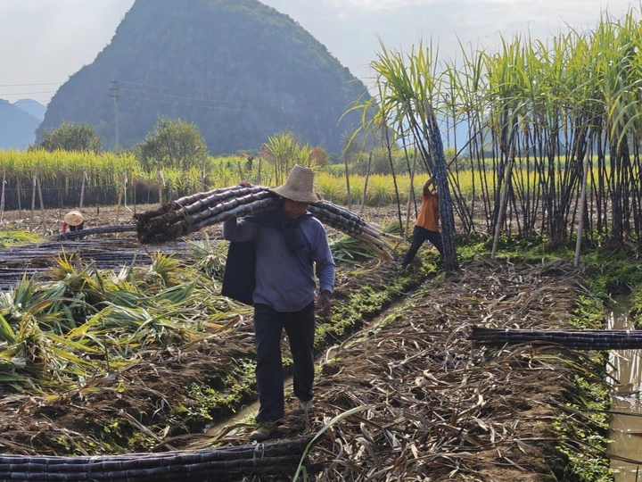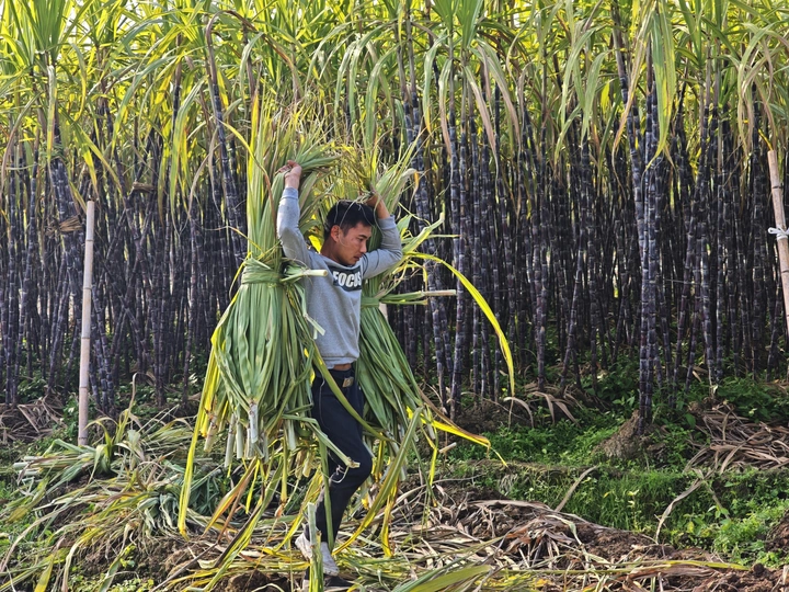 成片的黑皮甘蔗如密林般矗立,阳光穿透蔗叶洒下金辉,蔗农们穿梭在蔗海里忙碌收割,砍蔗、剥叶、搬运的身影,勾勒出南国蔗田秋收的鲜活图景。
