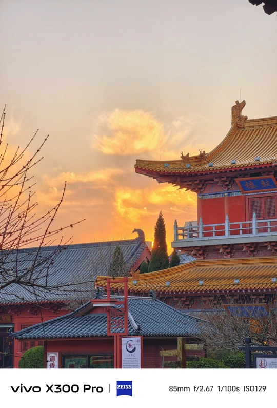 漫步禅院时,一抬眼便撞见了落日与古建相融的极致浪漫,赶忙举起vivo X300 Pro将这一幕定格。镜头里,整座禅院被漫天霞光包裹,鎏金的主殿屋顶在橙黄余晖里熠熠生辉,朱红的宫墙与青灰的瓦顶相映,在蜜色的天光下勾勒出错落的轮廓。 云霞如燃烧的锦缎,从天际一直铺到殿宇的檐角,浅金与橘红的渐变晕染开来,让空气里都飘着暖融融的气息。枯瘦的枝桠斜斜掠过画面左侧,疏朗的枝影与浓艳的霞光形成鲜明对比,添了几分清冷的禅意;殿旁的翠柏笔直伫立,深绿的枝叶成为暖色调里的点睛之笔,平衡了画面的视觉重心。 拍摄时,我刻意用长焦拉近了建筑与云霞的距离,让红墙金瓦仿佛从霞光里生长出来一般。光影在殿宇的雕栏与匾额上流转,每一处榫卯与纹饰都被落日镀上温柔的金边,就连禅院的指示牌与香烛标识,也成了这份画面里鲜活的生活细节。 这是城市喧嚣外的一隅静美,落日为禅院披上金纱,古建则让霞光多了厚重的底蕴。摄影于我,就是抓住这些不期而遇的美好,让瞬间的惊艳,变成往后翻阅时依旧心动的珍藏。