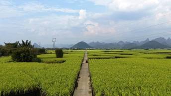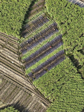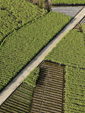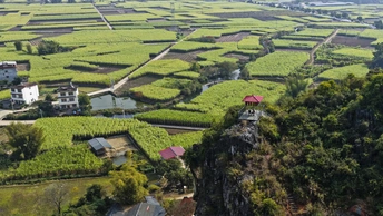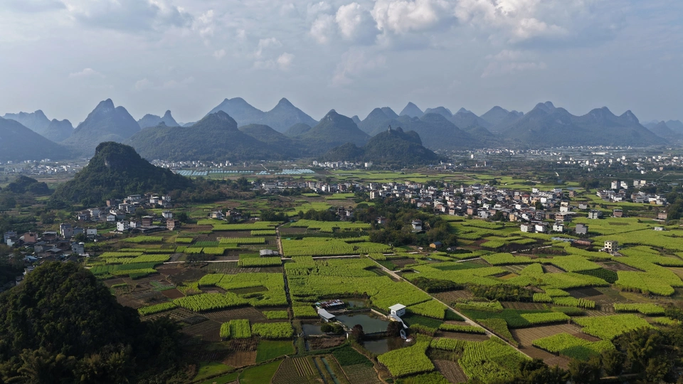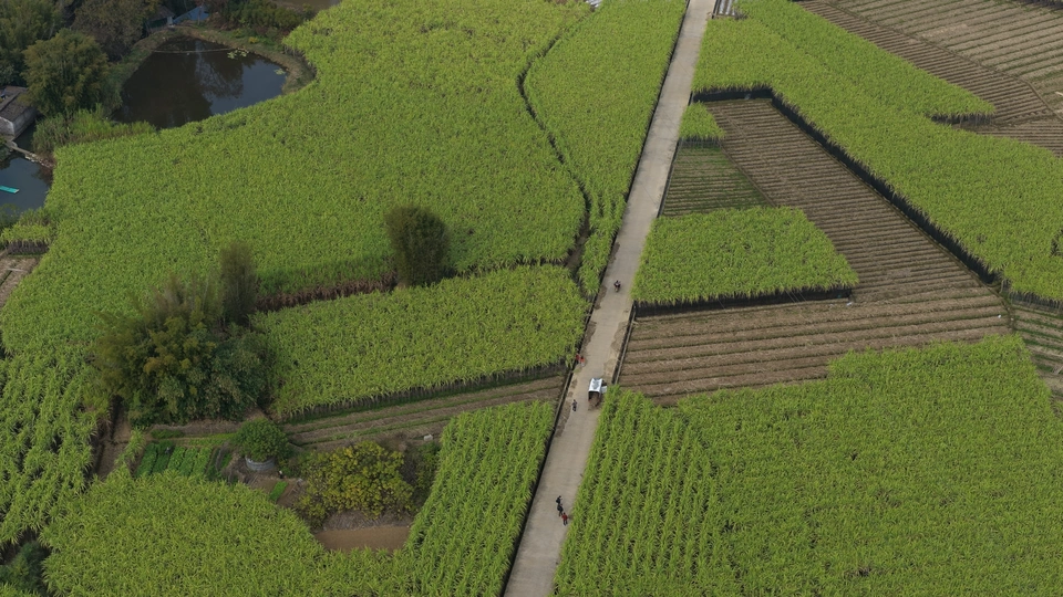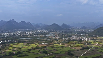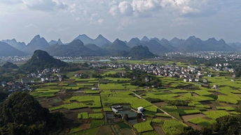这组航拍图展现了桂北喀斯特峰林间的甘蔗田风光:层叠的喀斯特山峰作背景,广袤的绿色甘蔗田如绿毯铺展在平地上,田垄间的水泥路纵横交错,分割出块状蔗田,部分地块可见收割后的蔗根痕迹,村寨与峰林相映成趣,将壮乡田园的秀美与农业生产的生机融合得淋漓尽致。