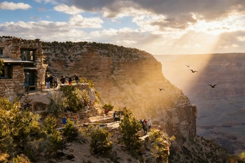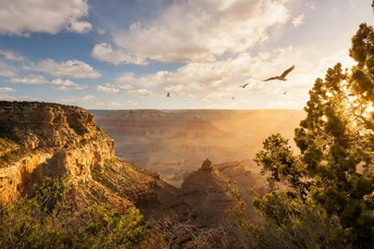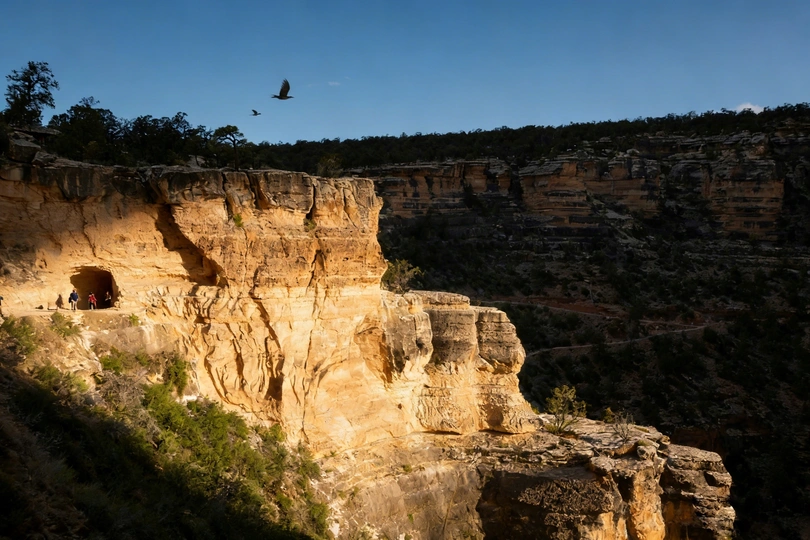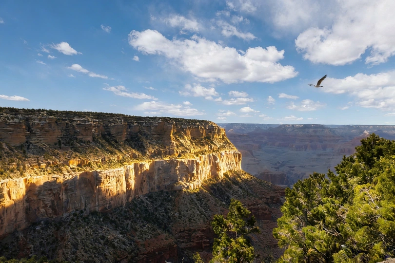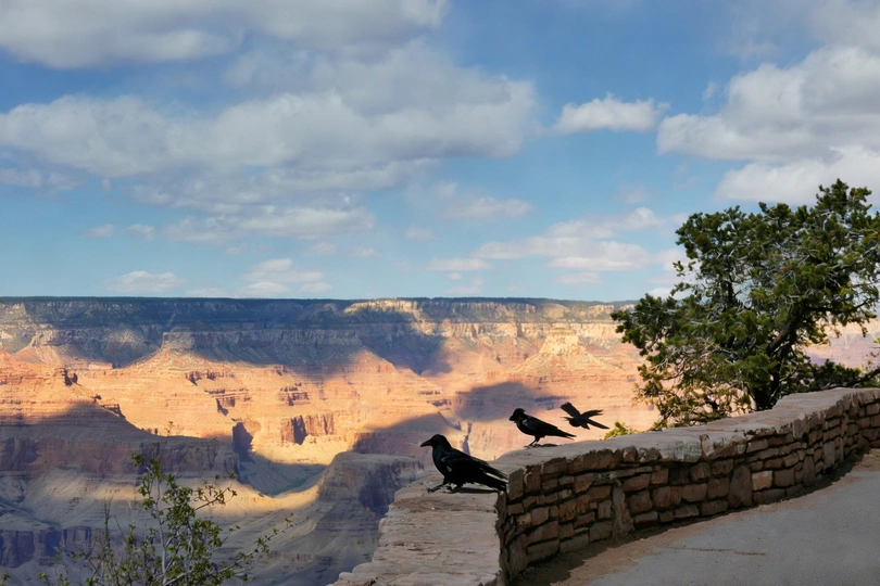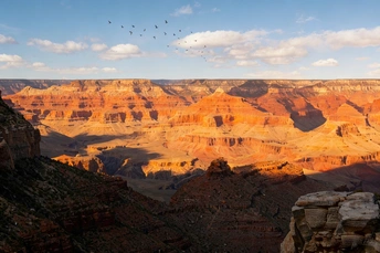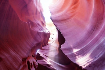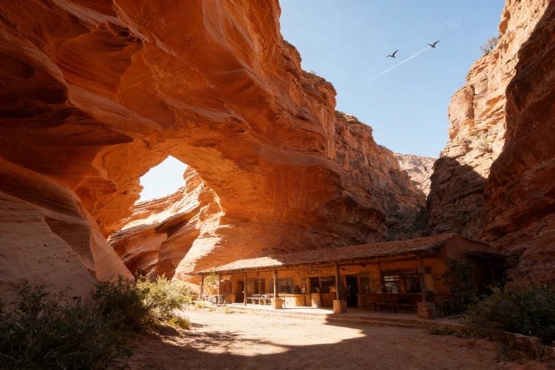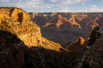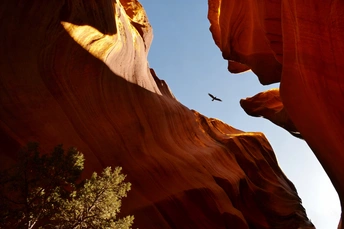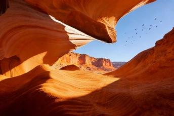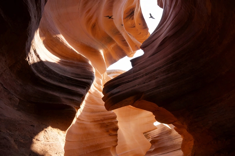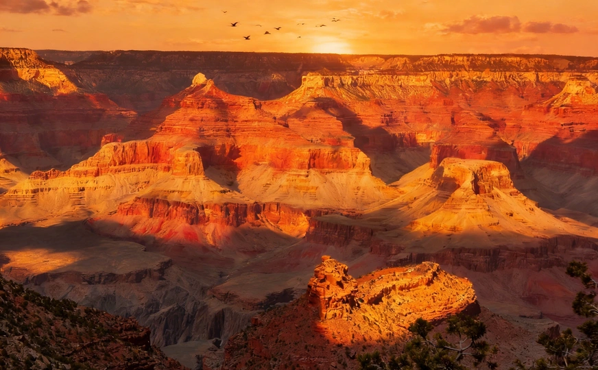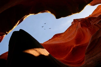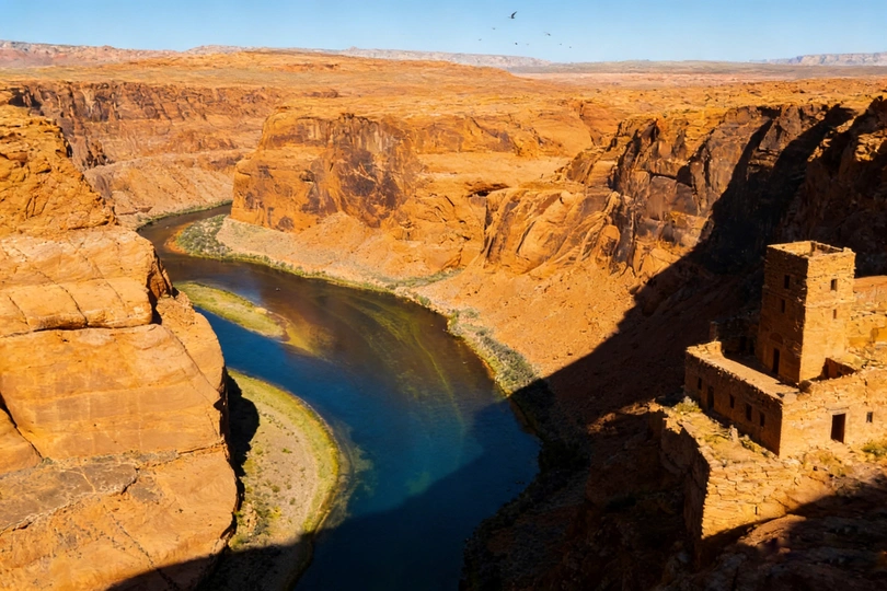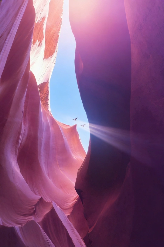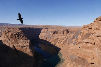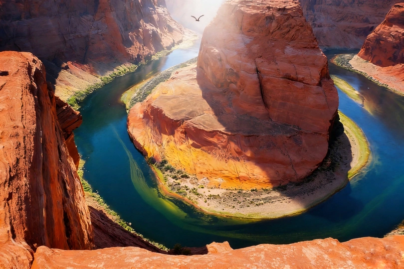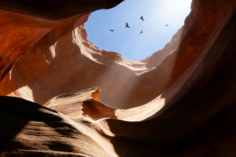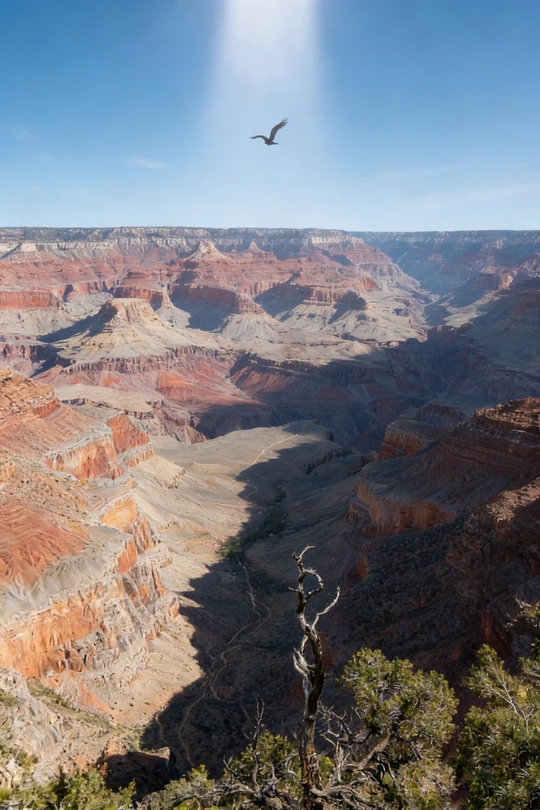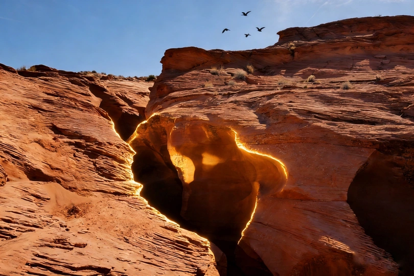 当阳光劈开科罗拉多的红岩褶皱,30帧峡谷图景便成了大地的诗行——羚羊谷的弧壁浸在金红的光晕里,风掠过的纹路里,隼鸟振翅裁碎了穹顶的天光;马蹄湾的碧水绕着赭石崖壁,流云投下的阴影随波纹轻晃,几只渡鸦正掠过峡谷的脊背,把鸣啼嵌进岩层的褶皱。 红岩的肌理在侧光里泛着暖调的绒光,枯树的枝桠挑着碎金,连沙砾都裹着薄纱似的雾霭;深谷间漏下的“上帝之光”织成光柱,飞鸟穿过时抖落的羽影,让静止的岩层有了呼吸。这是西部大地最鲜活的史诗,每一道光影、每一声鸟鸣,都在替亿万年的时光,轻诉峡谷的壮阔与温柔。