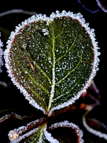 今晨下霜了,树叶像是镶上了一圈碎钻石,变得高贵起来,冻住了美丽,绽放了光彩。
