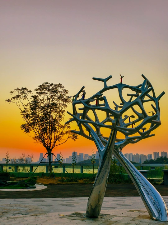 橘红浸染的天空下, 一棵是扎根大地的生命之树, 枝叶间流淌着风的低语; 另一棵是冷峻的不锈钢之树, 金属光泽折射出时间的棱角。 它们并肩而立,像一场无声的对话—— 关于生长,关于永恒,关于生命与机械的共生。