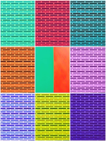 当色彩以几何的秩序铺展,视觉便坠入了一场奇妙的迷宫。这组画面里,九格色块如同被精心编排的视觉密码,每一格都有着独属于自己的色彩叙事。青绿与湖蓝的渐变里,细长的线条如粼粼波光,在画面里织就温柔的韵律;炽热的红橙色块则像燃烧的火焰,线条的排列让热烈多了几分规整的美感;紫与蓝的交融中,线条又化作静谧的星云,在渐变的底色里缓缓流淌。而中间那抹毫无修饰的绿橙撞色,像是这场秩序游戏里的意外惊喜,粗暴又直接地打破了线条的规整,却又在整体的九宫格布局里,达成了奇妙的平衡。每一根线条的排布、每一种色彩的过渡,都带着刻意的精准,却又在视觉上生出随性的动感。它们不是杂乱无章的堆砌,而是设计师用色彩与线条搭建的几何宇宙,在方寸之间,让渐变的柔与线条的刚、规整的秩序与跳脱的撞色相互碰撞、彼此成就。盯着画面久了,仿佛能听见色彩流动的声响,线条在渐变里舒展、延伸,把视觉的想象力拽向无限远。这是色彩的魔法,也是秩序的魅力,在九宫格的框架里,藏着最自由的视觉狂欢。