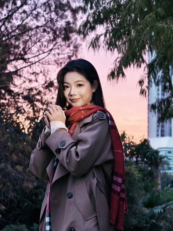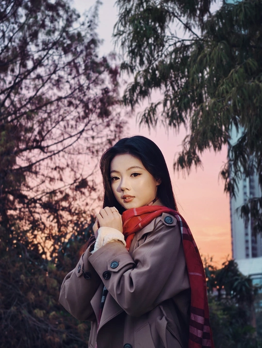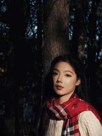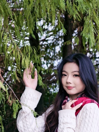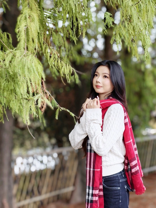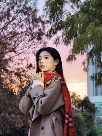夕阳穿透枝叶,为她镀上金边。 仰头的瞬间,光在睫毛跳跃, 像被风吻过的星子落进眼眸。 树影斑驳,呼吸都染上暖意, 这帧画面,是自然写给少女的情书。 她仰头接住一束神明的光, 睫毛沾着夕阳的余温, 眼睛盛着整个秋天的温柔。
