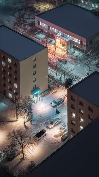 冬夜的校园被雪揉成了柔软的模样,路灯的暖光淌在积雪上,楼宇的窗灯亮着,像散落在黑夜里的星子。有人步履匆匆,有人驻足赏雪,清冷的蓝调雪景遇上温暖的橙色路灯,这是属于校园独有的冬日浪漫…