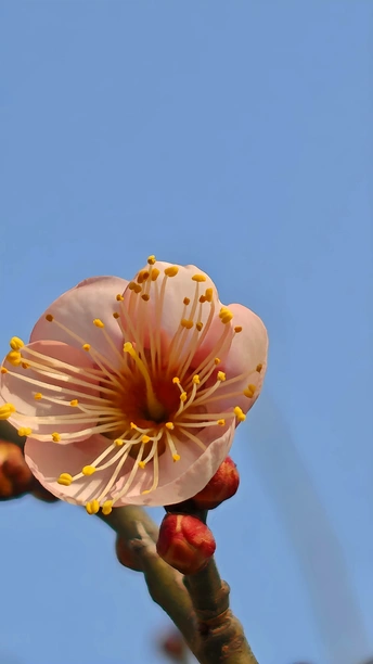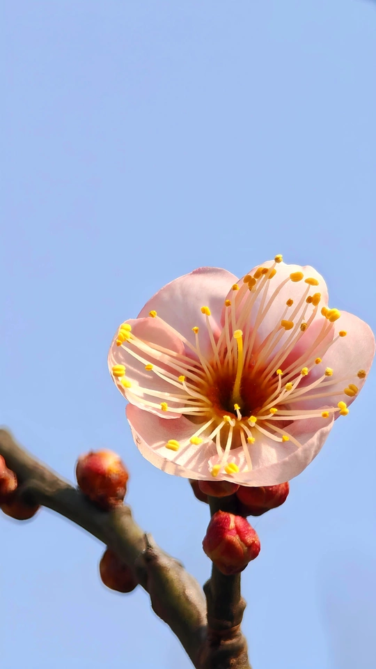 花瓣复瓣或重瓣,花色从淡粉到深红渐变。花姿优雅、花香浓郁,也是三大名贵梅花之一。(别角晚水、宫粉梅、朱砂梅)