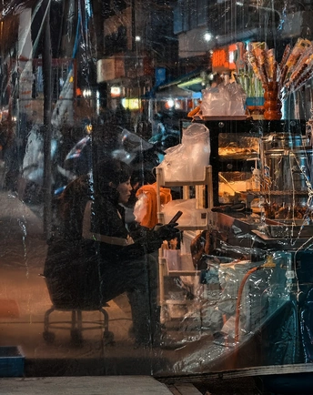 夜幕降临,街边的烤鸡档摊旁,摊主正专注地看着手机,仿佛与这座小镇的喧嚣隔绝,在忙碌中寻找属于自己的片刻宁静。或许她正在和远方的朋友分享这里的夜色,又或许只是在消解一天的疲惫。我想,这就是生活吧,总会有一些平凡瞬间,让我们感受到美好。