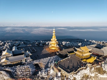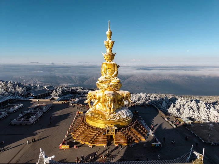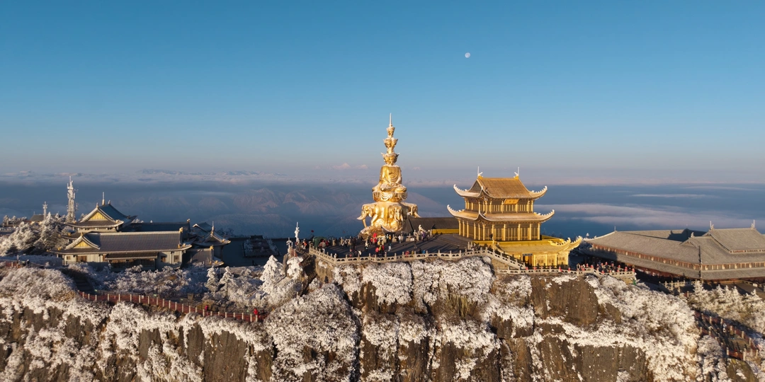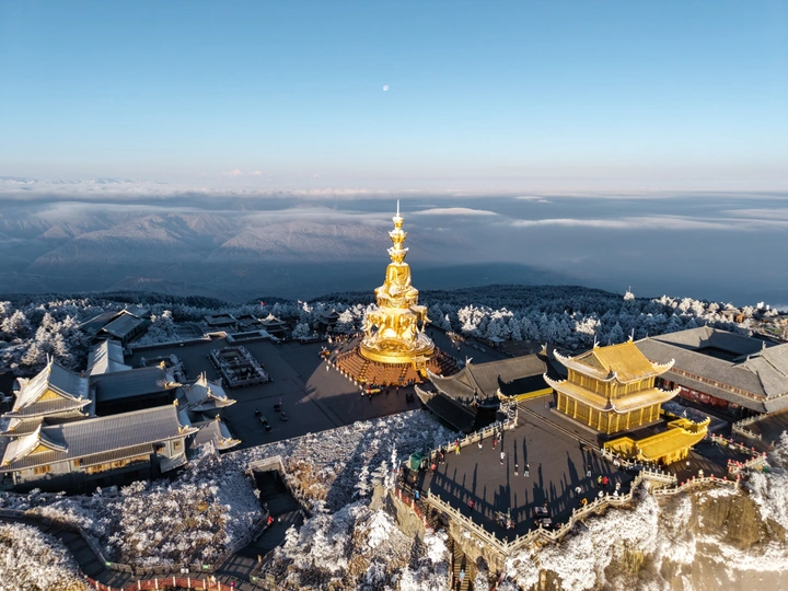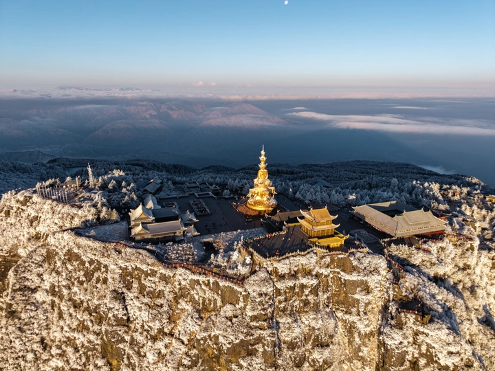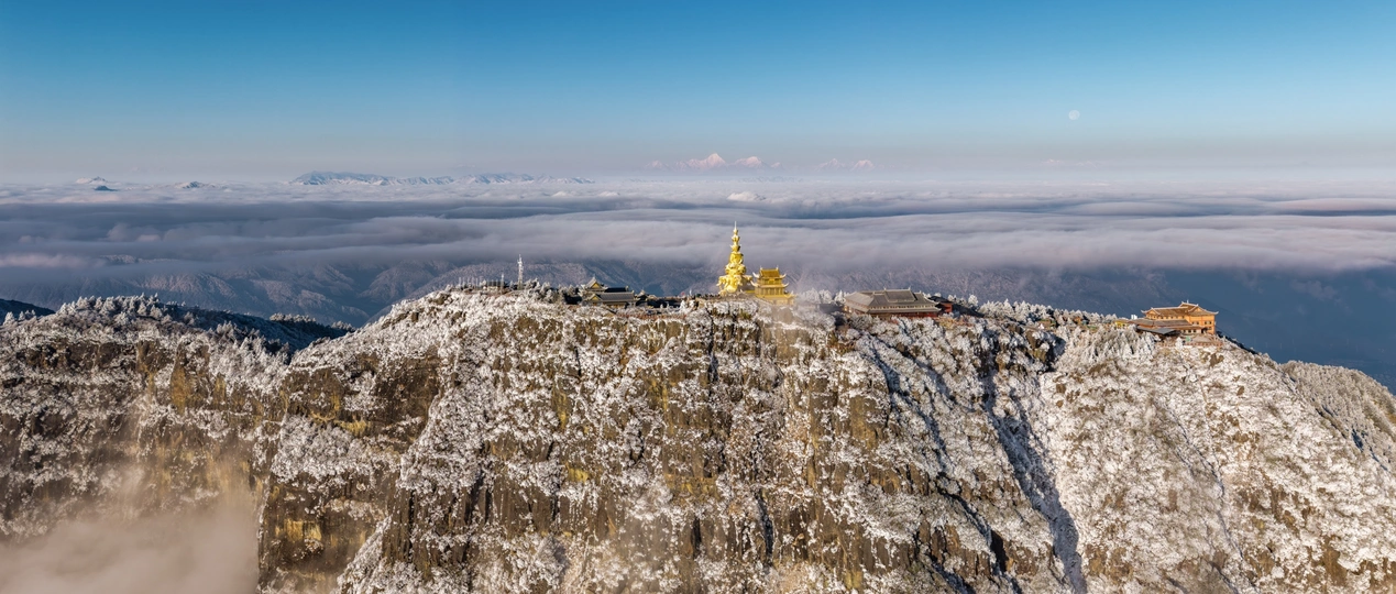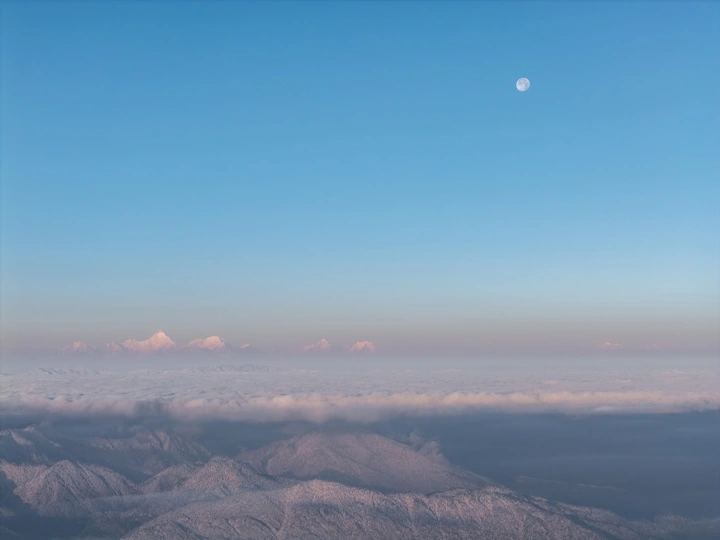 2026年1月5日清晨,在峨眉山金顶拍到壮观一幕,一轮明月仍高悬天际,皎洁月光清晰可见;远处的贡嘎雪山轮廓分明,在晨辉中泛着冷白光泽,与月亮的柔辉交相辉映,天地澄澈,画面纯净震撼。