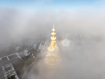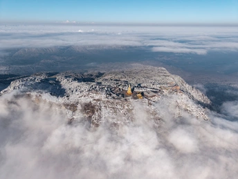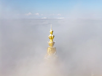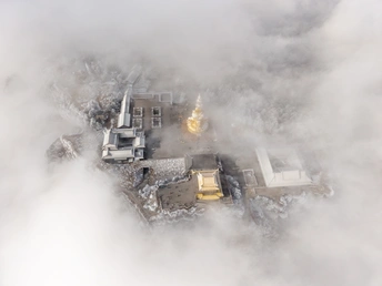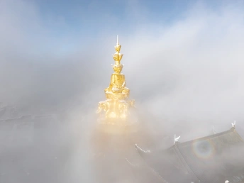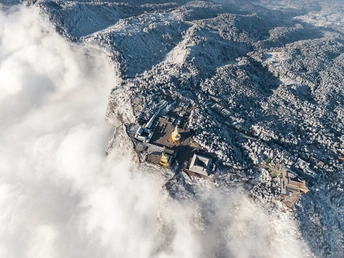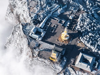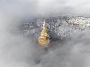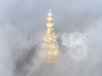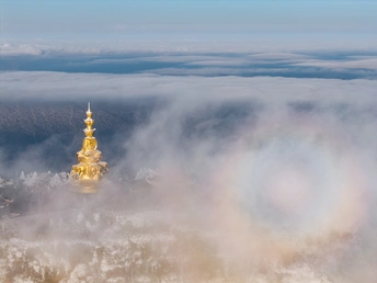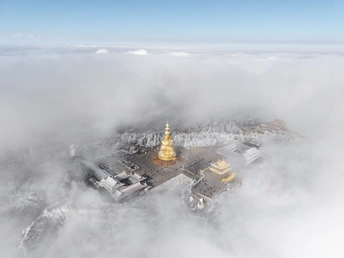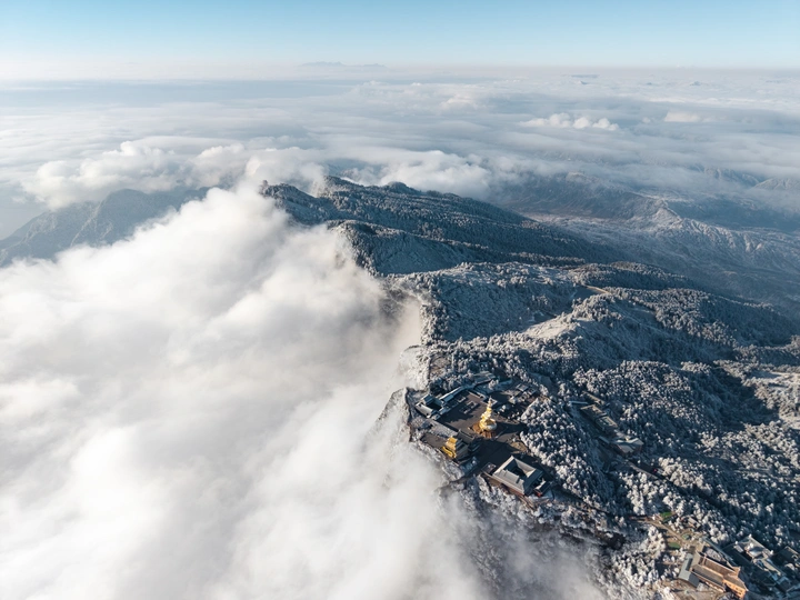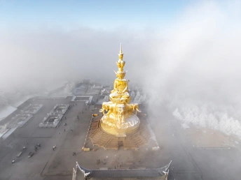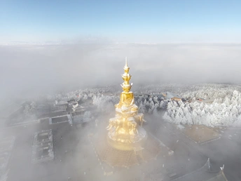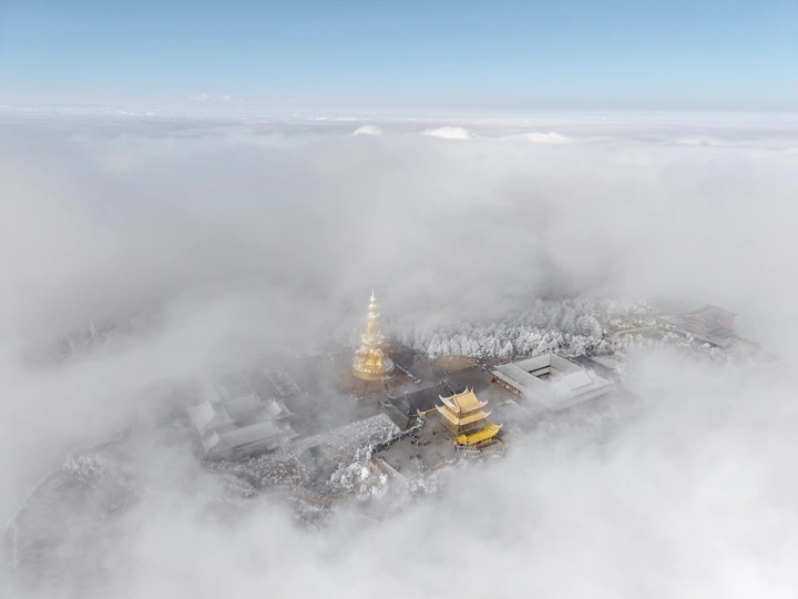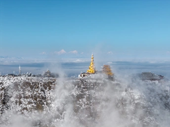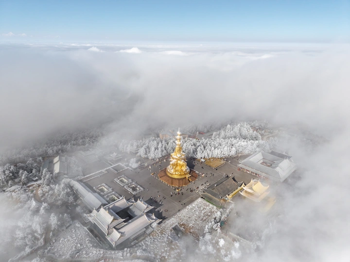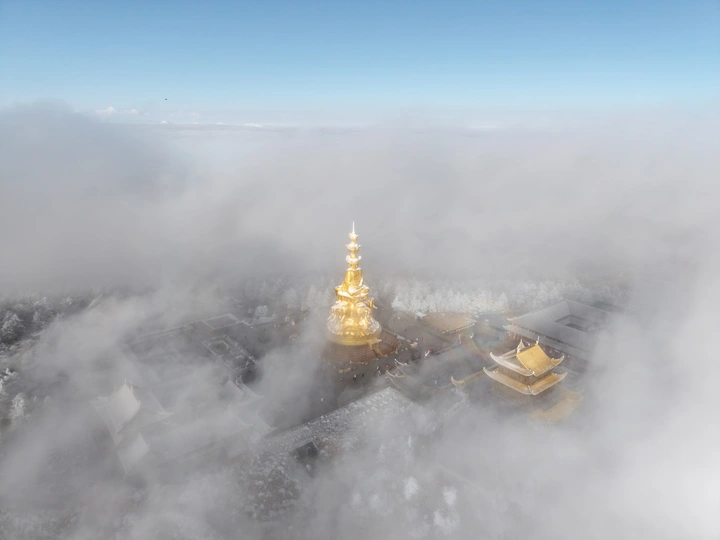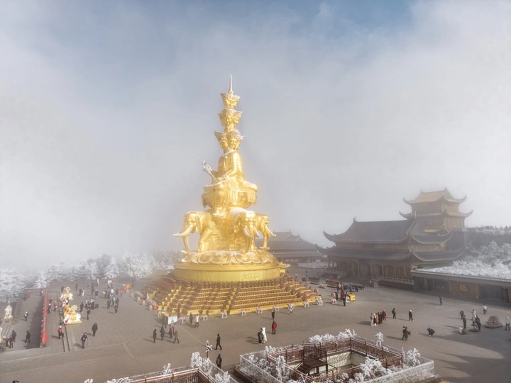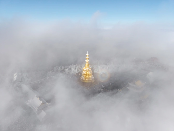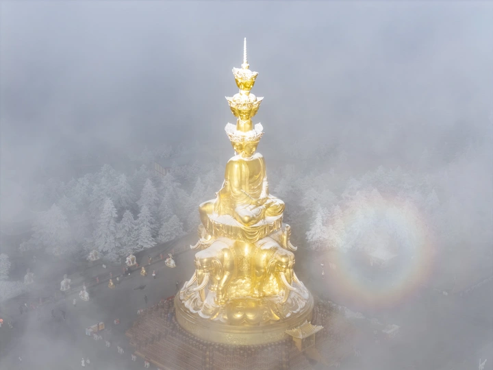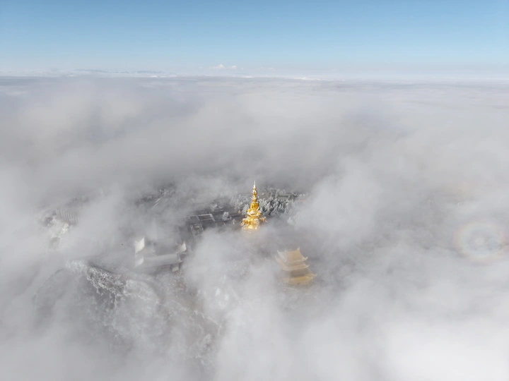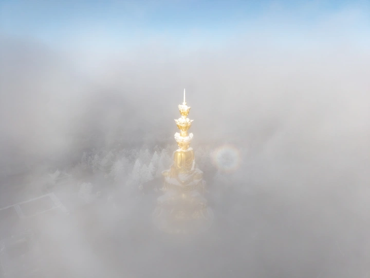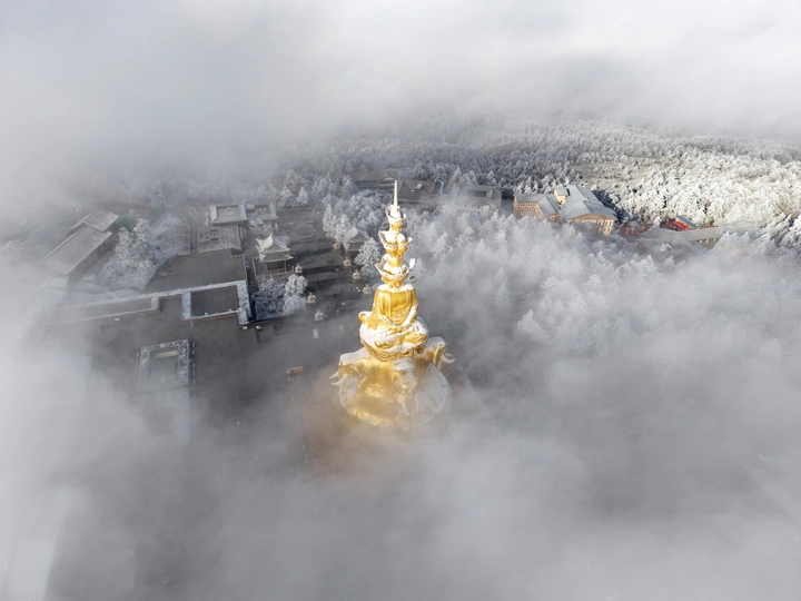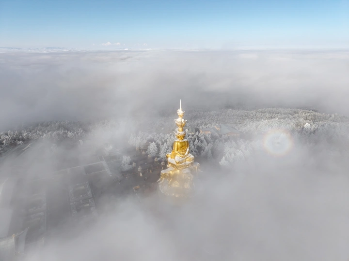 2026年1月5日,峨眉山金顶被浩瀚云海覆盖,白浪翻涌如潮。十方普贤金像端坐云间,庄严与缥缈交融,宛若天宫降临。阳光穿透云隙洒下金辉,佛影与云涛共舞,构筑一幅静谧圣洁的仙境画卷,令游人叹为观止。