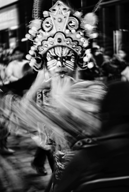 英歌舞者的身影穿过围观的人流,坚定的眼神目视前方,行云流水的动作在镜头中幻化成飒的身影!
