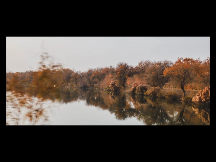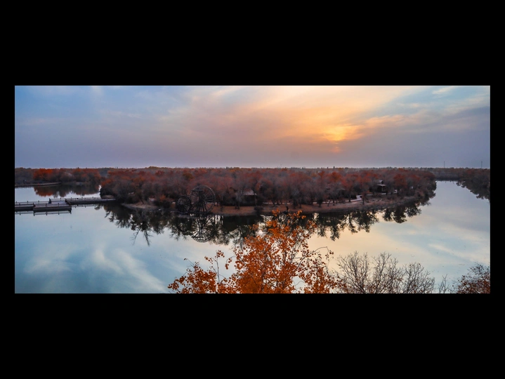 去往喀什的路上我决定路过巴楚县城时驱车往红海景区, 天空多云,夕阳刚漫过沙丘时, 先在胡杨林栈道旁拍下了胡杨与栈道相映的静态画面, 想留住大漠秋晨的静谧。 行至湖边时,忽然起了风, 用1/15s的慢快门跟着风的方向平移相机, 让胡杨的金黄枝叶揉成流动的色块, 拍出来的动态模糊意外有了写意的美感。 傍晚爬上景区的观景台, 恰好遇上落日熔金, 把红海的镜面湖水、成片胡杨和渐变的晚霞框进画面, 让这份大漠秋景多了点复古的温度。