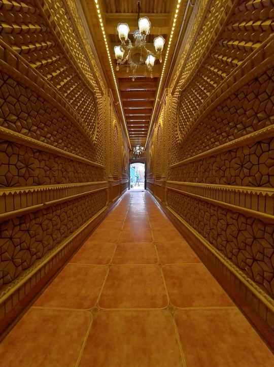 在喀什古城逛街的时候,我无意中走进一家民宿的长廊,目光被墙上独特的图案深深吸引住,感觉自己好像置身于维吾尔族建筑艺术的秘境。墙面几何图案如细密织网,在光影里流淌着岁月打磨的精致,吊灯洒落暖黄的柔光,与地砖的颜色相呼应,每道纹理都蕴含民族文化的细腻与厚重,轻轻叩响对西域风情的无尽遐想。
