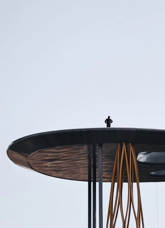 金属穹顶托着渺小的人影,在淡蓝的天空下,构成了一场关于高度与孤独的对话,清冷又充满力量。