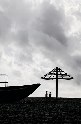 灰云下的沙岸,船与伞架的轮廓利落如刻,孩童身影在静默的黑白里,漾开属于沙滩的松弛与童趣。