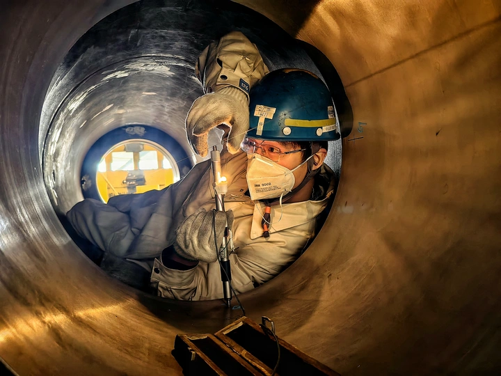 工地现场拍摄!孔洞中测量,当测量工具刚刚达到钢丝的时候,灯亮了,才是最准确的数值。灯光也照应着工人的脸庞,精彩瞬间。