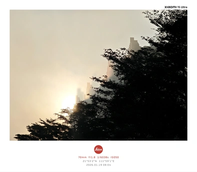 这张作品以仰视视角捕捉了晨光穿透疏密树冠的瞬间,斑驳光影洒落在半隐半现的现代建筑群落上。小米15 Ultra的70mm焦段(等效约105mm)营造出自然的空间压缩感,f/1.8大光圈使晨雾与建筑轮廓形成柔和过渡,ISO50的极低感光度确保高光区域(初升太阳与玻璃幕墙反光)细节完整,1/6038s快门凝固了光线在树影间流动的轨迹。