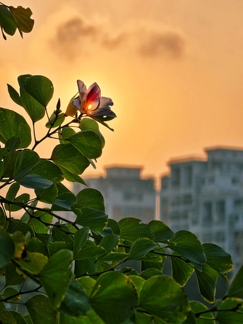 冬日雾天,旭日东升。用花朵遮挡朝阳,逆光拍摄。