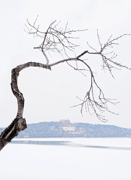 雪把天地晕成素白,枯树弯出一道温柔的弧,远处佛香阁在山影里,像从古画里走出来的景致。