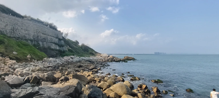 站在礁石上,咸湿的海风裹着阳光扑面而来,把所有烦恼都吹得轻飘飘的。远处的海面是渐变的蓝,从近处的澄澈一直晕染到天边的薄雾里,几座高楼在雾中若隐若现,像海市蜃楼。 偶尔有白色的水鸟掠过水面,翅膀点起细碎的涟漪。我找了块平坦的石头坐下,看着浪涛一波波涌来,撞在礁石上溅起雪白的泡沫,什么都不用想,光是发呆就很幸福。