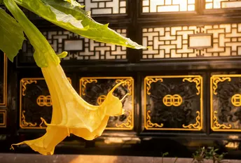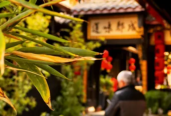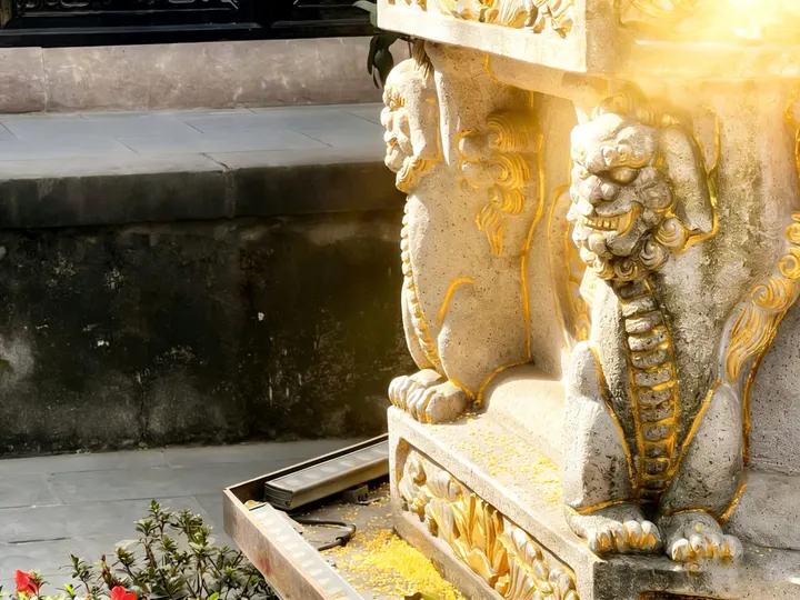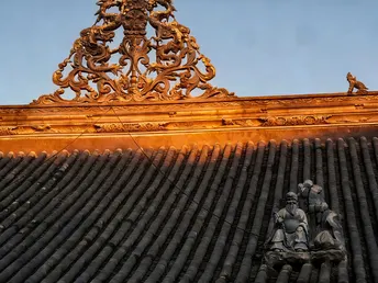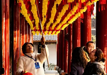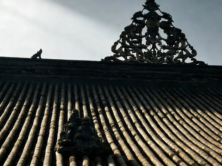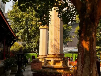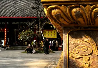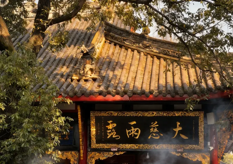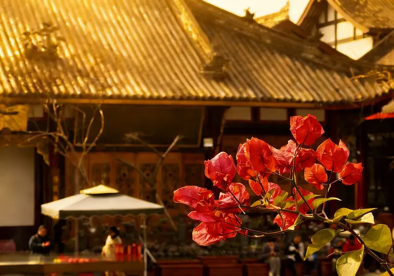 红墙黛瓦的檐角,正接住成都春日的柔光。大慈寺的屋脊上,端坐的瓦当仙人守着千年烟火,鎏金的经柱在树影里流淌着梵音。 巷口的竹影斜斜扫过“成都味道”的门楣,廊下红黄相间的祈愿幡,被游人的笑声轻轻拂动。墙角的曼陀罗花静静垂着,像藏着一段未说尽的禅意。 古刹与高楼在此处温柔相逢,一碗盖碗茶的热气里,是老成都最熨帖的日常。