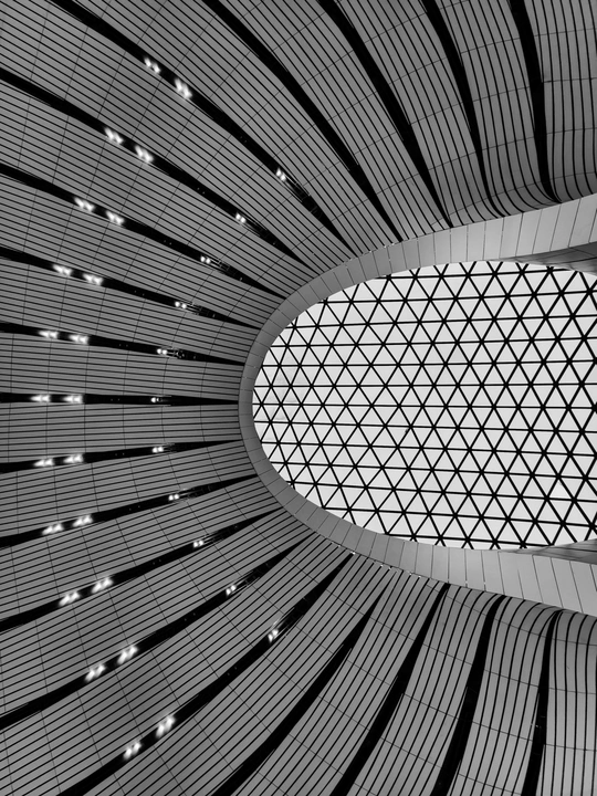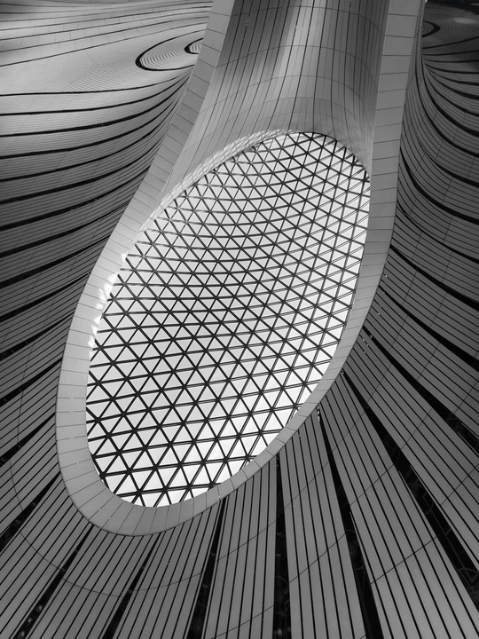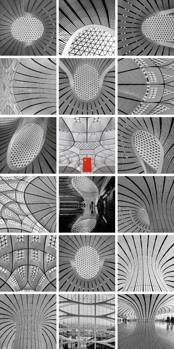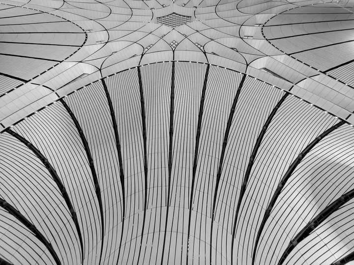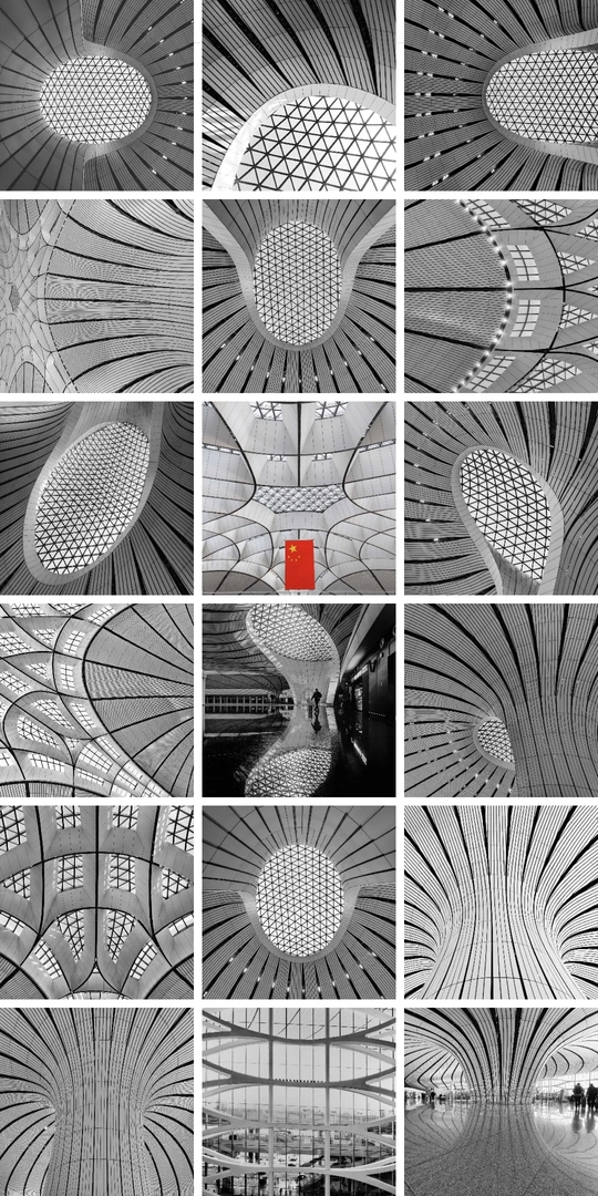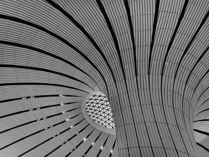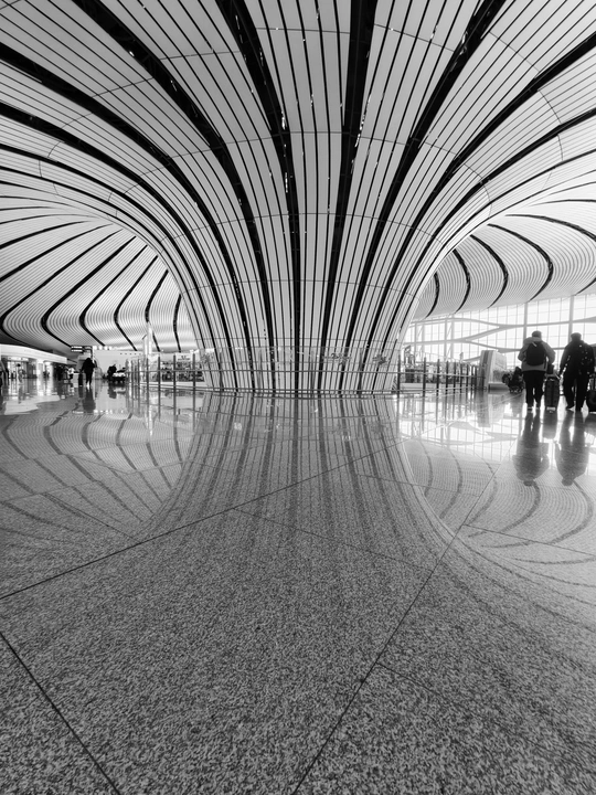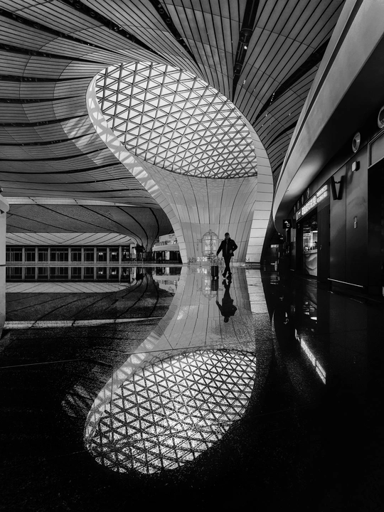 在大兴机场,用镜头读一首扎哈写的建筑诗。 剥离冗余色彩,让线条的韵律、光影的叙事、几何的秩序全然显现,每一寸结构都是建筑的骨骼与鲜活呼吸。 一场关于未来感的视觉漫游,终在晚霞漫染穹顶时抵达高潮。 当飞机划破暮色奔赴远方,建筑的冷峻诗意与人间的滚烫梦想撞个满怀,这便是最动人的共鸣。