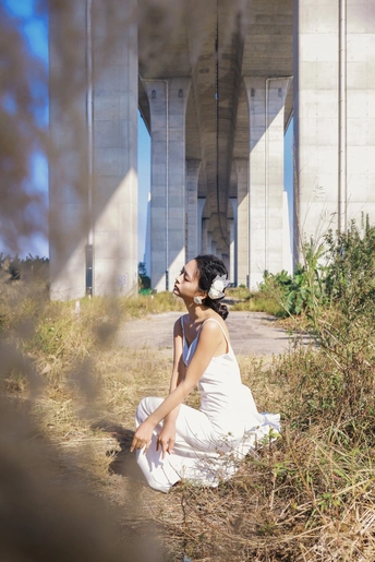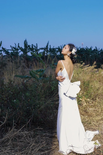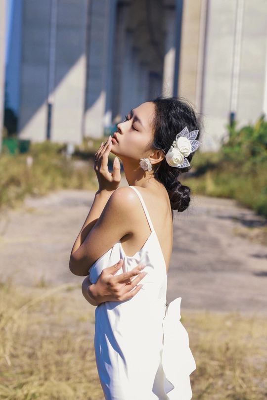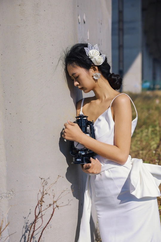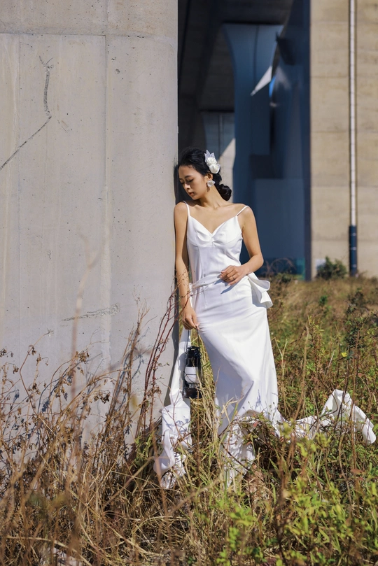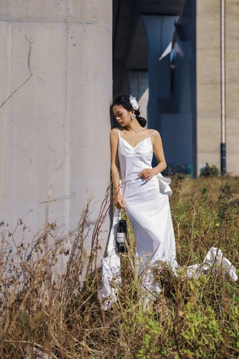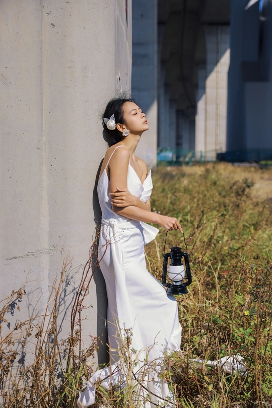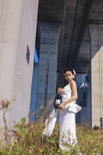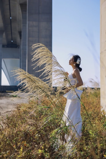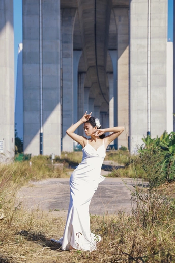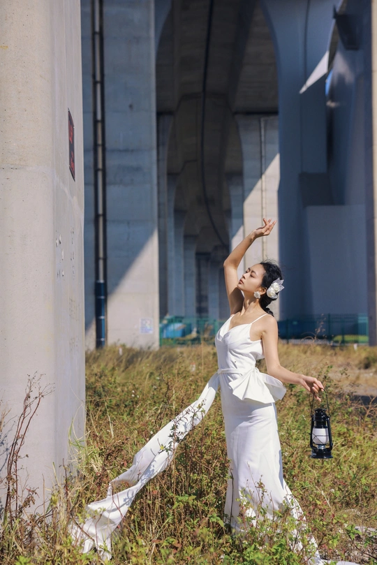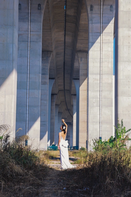 我们在桥底的荒草里,拍了一组关于「反差」的婚纱。 砼是城市的骨骼,纱是温柔的肌理。 风穿过桥墩时,白裙也跟着轻轻摇晃。